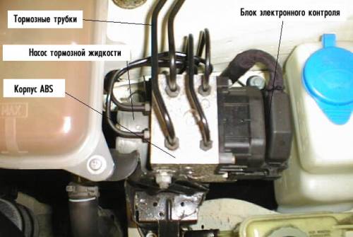 Конструкция АБС не очень сложна, но требует высокой культуры проектирования, производства и эксплуатации. В состав простейшей АБС входят блок управления (естественно, электронный), завязанный на него гидромодуль, включенный в общую тормозную систему автомобиля, датчик вращения колес и зубчатый диск, установленный на оси колеса и вращающийся вместе с ним