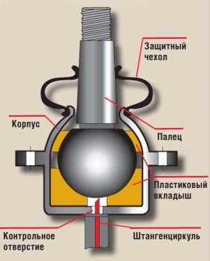 Шаровая опора – узел, соединяющий ступицу управляемого колеса и рычаг подвески. Ее задача – обеспечивать возможность поворота ступицы при сохранении положения колеса в горизонтальной плоскости при вертикальном его перемещении. Конструкция опоры достаточно проста. Это конусообразный палец со сферическим или грибообразным наконечником, способный вращаться и одновременно раскачиваться на небольшие углы в корпусе опоры. Корпус крепится к рычагу болтами или запрессовывается в него. В последнем случае шаровая, как правило, меняется вместе с рычагом подвески. В современных узлах чаще всего используется неразборная конструкция, в которой после установки пальца корпус завальцовывается. Между пальцем и корпусом помещаются пластиковые или другие вкладыши, работающие как подшипник скольжения и обеспечивающие небольшое усилие вращения. Для старых моделей российских машин в запасные части поставляются и разборные шаровые опоры, люфты в которых устраняются подтяжкой крышки.