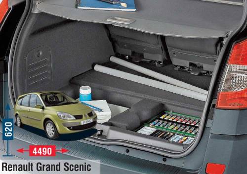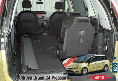 Только два из восьми участни-ков нашего обзора специаль-но созданы в 7-местной версии. Ее производят параллельно с 5-местной. Оба автомобиля – «французы»: Citroёn Grand C4 Picasso и Renault Grand Scenic. Приставка Grand у Citroёn говорит о дополнительных двух местах и 12 см длины по сравнению с 5-местной машиной, а у Renault – еще и большей на 5 см колесной базе (авто стало длиннее на 23 см). Все герои теста при полной загрузке салона пассажирами демонстрируют весьма скромные размеры багажных отсеков. Только у Citroёn Grand C4 Picasso, Renault Grand Scenic, Ford S-Max и Mitsubishi Grandis полезный объем превышает 200 л.
