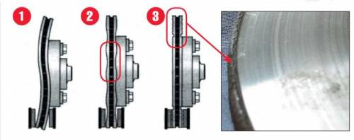 Необходимость ремонта или замены диска возникает при: деформации диска (1), неравномерной толщине по окружности (2), образовании буртиков (3)