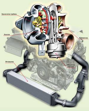 Турбонаддув (турбонагнетатель, турбокомпрессор) – устройство, предназначенное для уcиления мощности двигателя без увеличения его рабочего объема. Достигается это за счет сгорания в цилиндрах большего количества топливовоздушной смеси, что как раз и обеспечивает турбокомпрессор, который загоняет в цилиндры больше воздуха, чем в случае его всасывания «поршнями». Турбонаддув – это центробежный воздушный насос, приводимый в действие турбиной, раскручиваемой потоком отработавших газов. Он засасывает воздух через фильтр и под давлением нагнетает его в цилиндры двигателя. Чем больше воздуха подает компрессор, тем больше топлива можно сжечь, соответственно – получить большие крутящий момент и мощность. В зависимости от создаваемого давления наддува турбокомпрессоры бывают низкого (0,2-0,8 атм. при 110–130 тыс. об/ мин) и высокого (0,8–2,2 атм. при 150–210 тыс. об/мин) давления. Турбонаддув обеспечивает прирост мощности на 25–100%. При сжатии компрессором воздух нагревается, из-за чего уменьшается его плотность при давлении наддува, а соответственно, и масса в объеме цилиндров. Чтобы минимизировать это явление, выходящий из компрессора разогретый воздух пропускают через специальный радиатор (интеркулер). Используется данная технология в основном в турбонаддувах высокого давления. На некоторых моделях машин устанавливают даже 2 интеркулера, а для оптимального наддува на разных оборотах применяют турбокомпрессоры с изменяемой геометрией или устанавливают по две турбины разного размера. Турбонаддув используют как в бензиновых, так и в дизельных ДВС.