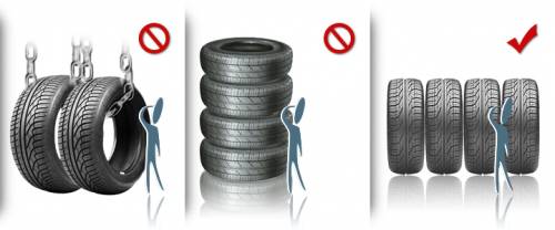 Перед тем как положить зимние шины в гараж, пометьте левые/правые и передние/задние. Покрышки на дисках должны храниться в горизонтальном положении, без дисков – в вертикальном.