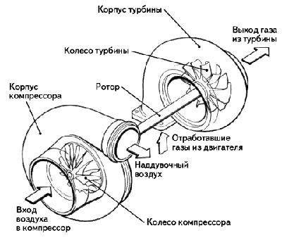 Выхлопные газы вращают одну из крыльчаток турбины, а вторая, находящаяся в ней на одном валу, нагнетает воздух в систему