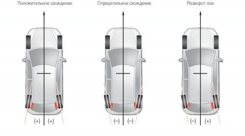Схождение - угол между направлением движения и плоскостью колеса. Величина схождения влияет на прямолинейность движения. На передней оси переднеприводных автомобилей схождение делают нулевым или немного отрицательным.