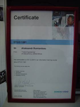 Наша организация имеет право представлять интересы SIEMENS VDO в любых государственных органах Республики Беларусь согласно официальному письму немецкой стороны. Так, в 2006 году мы сертифицировали все тахографы торговой марки Kienzle, которые выпускает компания SIEMENS VDO, это приборы 1318, 1319, 1324, а на прошлой неделе мы получили сертификат Госстандарта на цифровой тахограф DTCO 1381.