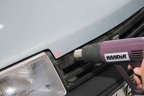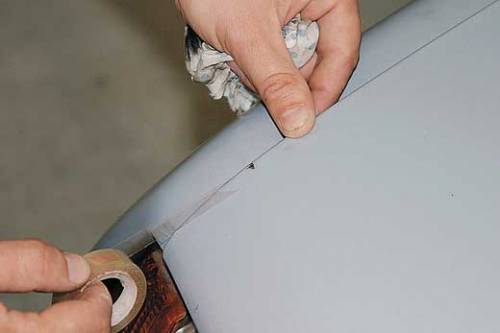 Покрытие оптимальной толщины удается получить при нанесении грунта и краски методом распыления из аэрозольных баллончиков. Однако при их использовании поверхность вокруг ремонтируемого участка нужно оклеить скотчем, предварительно вырезав в нем отверстие по размерам повреждения. Чтобы проверить, высохла ли краска, можно нажать на нее ногтем или боковой поверхностью спички. Если краска прогибается, продолжают сушить.