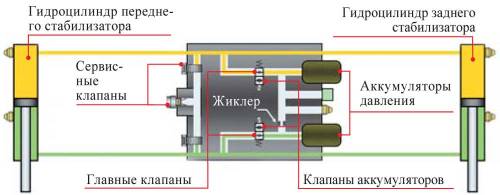 Когда главные клапаны открыты, поршни подвижны, стабилизаторы не имеют жесткой связи с кузовом, оставаясь «мягкими». Распознавая перспективу крена, ЭБУ закрывает клапаны, прекращая циркуляцию жидкости, и поршни фиксируются. Стабилизаторы обретают жесткую связь с кузовом и становятся максимально эффективными. Для комфорта на мелких неровностях предусмотрены аккумуляторы, поглощающие пульсации давления. Когда требуется дополнительная жесткость, клапаны аккумуляторов также перекрываются |