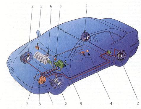 Схема ESP: 1 — гидравлический агрегат, обеспечивающий вместе с гидровакуумным усилителем тормозов необходимое давление в системе; 2 — датчики числа оборотов колес; 3 — датчик угла поворота рулевого колеса; 4 — датчики рыскания и поперечного ускорения; 5 — электронный блок управления двигателем; 6 — привод дроссельной заслонки; 7 — топливные форсунки; 8 — электронный блок управления ESP; 9 — датчик положения педали акселератора.