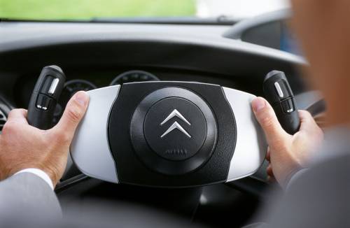 Внешне – ничем. Необычность этого автомобиля осознаешь, когда оказываешься на месте водителя. Не ищите привычные педали, рычаги и подрулевые переключатели. Их здесь нет. Нет и рулевого колеса в традиционном его понимании. Взамен предлагаются две рукоятки, расположенные по обе стороны ступицы. Ступица руля к тому же обзавелась еще и “ушами”. Вот на рукоятки и “уши”, в совокупности составляющие то, что Citroen назвал водительским интерфейсом, и вынесено все управление автомобилем.