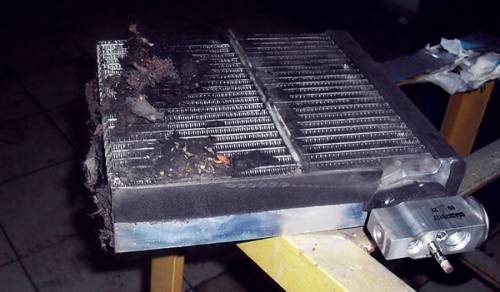После недолгих поисков причин мастер поставил диагноз: надо снимать и чистить испаритель кондиционера. Длительная езда без салонного фильтра привела к тому, что грязь попадала в систему и “налипла” на испаритель. А тот по специфике своей работы “запотевает”: по нему стекает конденсат. В условиях темноты и влажности попавшая в систему грязь разлагается – вот и причина запаха. На вопрос владельца: нельзя ли обойтись менее радикальными мерами – например задуть в систему какую-нибудь химию из баллончика, мастер ответил отрицательно. И когда он снял испаритель и показал владельцу – тот понял почему (см. фото).