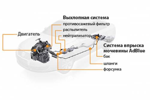 Мочевина AdBlue смешивается с выхлопными газами перед селективным катализатором SCR. В результате химической реакции аммиака, получаемого при высокой температуре катализатора из мочевины, с вредными окислами азота получается азот и вода. Поскольку расход мочевины около 100 миллилитров на 100 километров, пополнять 20-литровый бак можно только во время планового посещения сервиса. Разумеется, за счет более сложной конструкции системы выхлопа отработанных газов автомобили с “голубой” технологией требуют качественного топлива минимального стандарта «Евро-4».