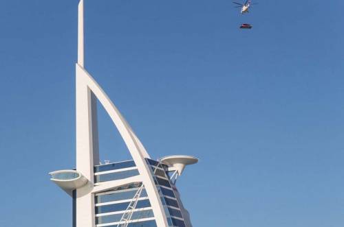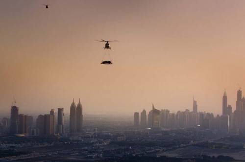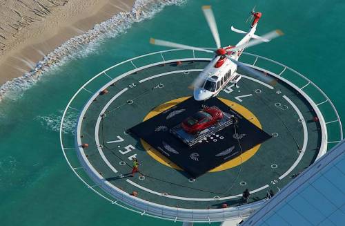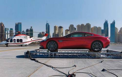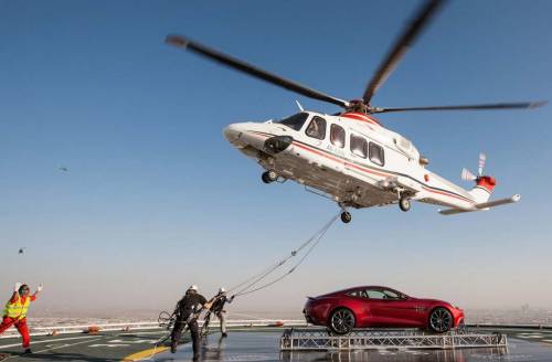 Но самым ярким событием стал запуск обновлённого Vanquish в небо. Подвесная платформа, прикреплённая к вертолёту, позволила взлететь автомобилю туда, где не была ни одна машина в мире — знаменитая вертолётная площадка отеля-паруса Бурдж аль-Араб в Дубае, находящаяся на высоте 1000 футов (302 метра) над уровнем моря.