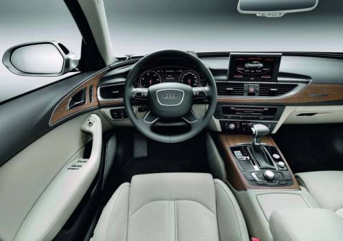 Новинка получила фирменный четырехспицевый руль, на который вынесены основные органы управления климатом и магнитолой. А6 получила новую приборную панель. Между тахометром и спидометром (размечен до 300 км/ч) – информационный ЖК-дисплей. В отличие от BMW и Mercedes, Audi не делает очень массивную центральную консоль в дорогих моделях. Между воздуховодами климатической системы и тоннелем собрано лишь самое необходимое. Гораздо больше пространства занимает непосредственно центральный тоннель, на главном месте которого находится рукоятка АКПП.