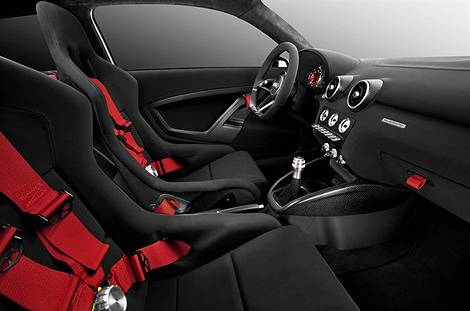 В салоне Audi A1 clubsport quattro появились сиденья от суперкара R8 GT с четырехточечными ремнями безопасности, карбоновое рулевое колесо и тканевые петли вместо дверных ручек.