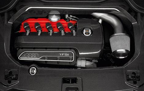 Новинка стала шире на 60 миллиметров, а также получила изготовленную из усиленного углеволокном полимера крышу, агрессивный аэродинамический обвес, многие элементы которого выполнены из карбона, шестипоршневые тормозные механизмы с карбон-керамическими дисками на передней оси (сзади установлены обычные стальные диски), подвеску с регулируемыми амортизаторами и 19-дюймовые колесные диски с покрышками размерности 255/30. Кроме того, патрубок выпускной системы, так же как у гоночного Audi A4 DTM, выведен на левую сторону машины и установлен перед задними колесами.