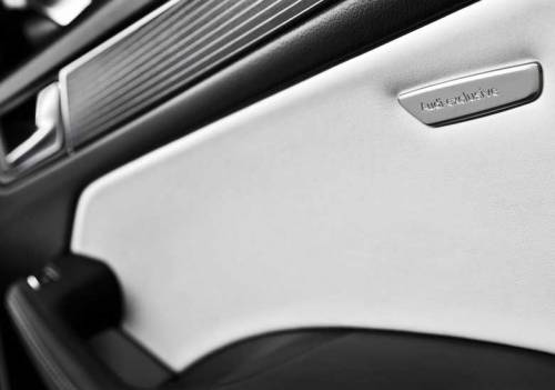 Внутри салона кругом используется черная кожа Nappa с белой строчкой и светлыми вставками на сиденьях. Потолок зашит алькантарой, передняя панель также отделана кожей, а добавляют лоска натуральные вставки из дерева.