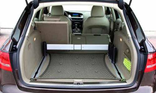 Как и во всех универсалах от Volvo, в XC 70 переднее пассажирское сиденье тоже можно сложить. Кроме этого, заднее разделено на три по отдельности складываемые части, и в серийную комплектацию входит внутренняя решетка для багажного отделения. У Avant вместо этой решетки есть разделительная сетка, он имеет удобный подвижный пол багажника, который при необходимости может выполнять роль вынимаемого контейнера для загрязненных вещей. С объемом багажника 490 (максимум 1430) литров «Ауди» позиционируется скорее как универсал-люкс, чем как утилитарный автомобиль.