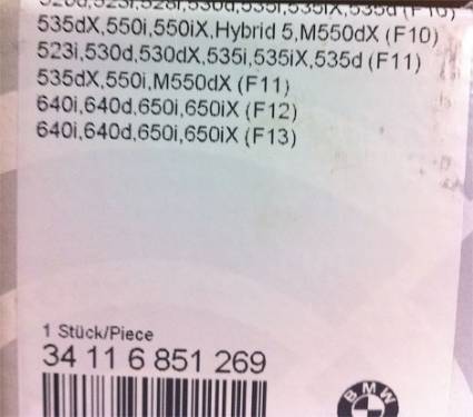 Стало известно название новой модификации BMW 5-Series — M550d xDrive, чей дебют ориентировочно состоится в следующем году. Об этом сообщил пользователь сайта Motor-Talk, опубликовавший фотографию информационной наклейки на коробке с тормозными колодками с указанием моделей, для которых они подходят.