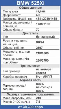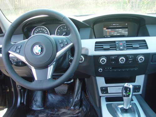 А найти в нем недостатки действительно сложно. Даже во внешности: как бы ни ругали нынешний стиль БМВ, «пятерка», особенно в черном цвете, – классика, настоящий «породистый» седан бизнес-класса. Материалы отделки салона тестовой 525-й тоже были черными, со вставками, выполненными из алюминия. Если садишься в такой автомобиль не в строгом костюме и начищенных до блеска туфлях, а в кроссовках и джинсах – чувствуешь себя неуютно. Ведь нужно же соответствовать этому строгому оформлению передней панели, отменному качеству пластика и совершенной эргономике. Потрясающее кресло, в меру мягкое, с отменной боковой поддержкой, позволяет уже через несколько секунд манипуляций с джойстиками электрорегулировок подобрать оптимальную посадку. Удобная и красивая «баранка» сама ложится в руки, информация с приборов отлично считывается, ни один из органов управления не требует особого привыкания. За исключением нефиксируемых подрулевых рычажков, конечно же…