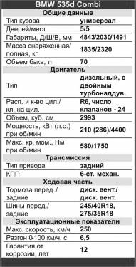 Один раз я уже встречался с ней. Во время поездки в Мюнхен я проехал на BMW 535d, которая одновременно удивила мощью, элегантностью, качеством исполнения и небывало низким расходом топлива. Признаюсь, расставаться с баварской машиной было трудно, и в голове на какое-то время прочно поселилась мысль о том, что неплохо было бы приобрести подобный автомобиль. Прошло два года, и почти забытое ощущение гармоничного слияния дизельного топлива, шести цилиндров и двух компрессоров различной геометрии вернулось. На почетном месте паркинга гордо красовался «баварский денди», на этот раз серо-стального цвета в версии комби, и снова строил свои грозные мины. Но при ближнем рассмотрении под маской злых гримас можно было заметить легкую усмешку. Это BMW 535d Touring провожал улыбкой своих конкурентов, на которых приезжали или отъезжали водители из местных офисов.
