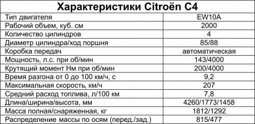 Первое, на что обращаешь внимание – зеркала, стильные, но не удобные. При движении задним ходом невольно поворачиваешь голову назад, дабы ничего не задеть. Ладно, смерились. А как быть, если сзади есть пассажиры? Поехали вперед. Тахометр, спидометр, километраж, стереосистема, различные датчики. Как за этим уследить, когда все параметры разбросаны на четырех разных ЖКИ-дисплеях? По всей видимости, эргономика была «казнена» в пользу стиля. На тестируемом экземпляре установлен 2-литровый бензиновый «атмосферник» с четырехступенчатым «автоматом». Машина разгоняется достаточно неплохо, подхват наступает в районе 3500 – 4000 оборотов двигателя, но на свои 2000 кубических сантиметров и 143 лошадиные силы откровенно не тянет, да и АКПП за мотором не совсем успевает. Включаем режим «спорт» и ощущаем… ничего. Да, машина стала немного «веселей», но и это не то. Попытка №3 – ручной режим! Отставить! Движения рычага КПП настолько неточные и смазанные, что вместо второй передачи можно запросто переключиться на третью. Остаемся на АКПП. Как-то жестковата машина себя ведет, «мелочи» не замечает, а вот на крупных колдобинах и ямах отечественных дорог достаточно жесткая и шумноватая. Да и несмотря на свою жесткость достаточно сильно кренится. Неужели хорошо зарекомендовавшие себя торсионы или гидропневматику французы разучились делать? Да нет. Секрет в том, что С4 построен не на собственной платформе, а на «донорской» - Peugeot 307. Отсюда «МакФерсон» спереди, скручивающаяся балка сзади. Без претензий, но и без пикантности.