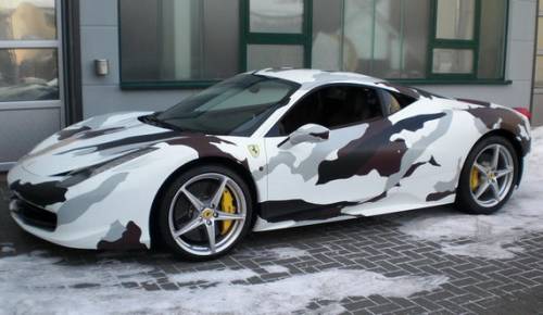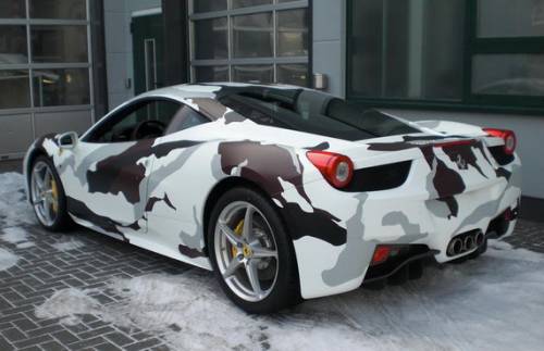 Так, неизвестный немецкий фанат Ferrari решил сделать из своей 458 некоторое подобие военной машины, ведь иного объяснения столь оригинальной камуфляжной оклейки найти сложно. Несмотря на кажущуюся не сочетаемость понятий Ferrari и «армия», все получилось достаточно гармонично, а главное – внимание окружающих обеспечено.