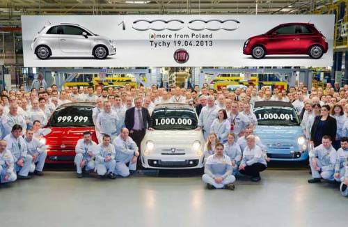Миллионный «чинквеченто» сошёл с польского конвейера 19 апреля 2013 года. Производитель сообщает, что машинка отлично продаётся в Италии, Великобритании, Бразилии, Южной Африке, Польше, США и Японии. Юбилейный Fiat 500 Abarth собран для итальянского рынка, окрашен в белый цвет и оснащён мощным 135-сильным двигателем объёмом 1,4 литра. Порядковый номер 999 999 получил красный 95-сильный Fiat 500 с мотором 1,3 Multijet, а следующий за юбиляром голубой 69-сильный кабриолет для немецких покупателей открыл новую страницу в жизни завода.