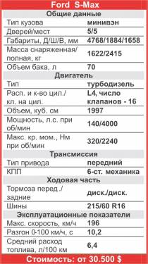 Дизельная сущность того S-Max, что попал к нам на тест, нисколько не противоречит его спортивной, динамичной сущности. По мощности он уступает всего две силы своему двухлитровому собрату, но в спринте до ста километров в час он все равно его обгонит. Все дело в огромном крутящем моменте, который даже больше, чем у бензинового 2.5 турбо! А расход топлива ни разу не поднялся выше 9 литров, даже в самых жутких пробках. При баке в 70 литров вы легко сможете заправить его в другой стране, если качество солярки по дороге от Минска до ближайшего зарубежья заставляет вас волноваться. На трассе S-Max ведет себя как обычный легковой автомобиль, словно он весит не две тонны, а две унции, да и ручная коробка сохраняет динамику даже на шестой передаче, когда большинство бензиновых автомобилей уходят в режим экономии. Звукоизоляция сработана на ура, свист ветра проявляется далеко за 160 км/ч, да и двигатель не особенно досаждает. Музыкальное сопровождение, пусть и не класса hi-end, пожалуй, даже превосходит ценовой класс машины. А еще фордовцы предлагают устанавливать на машину новое поколение Hi-Fi-стереосистем от Sony.