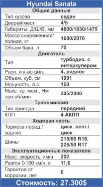 Цена тестируемого автомобиля – 27.300 долларов США. Много это или мало? Как для кого. Может, кому-нибудь больше по душе подержанная германская техника. Но для кого лозунг Генри Форда: «Лучший автомобиль – новый автомобиль» – не пустые слова и кому нужен хороший недорогой, но престижный автомобиль – стоит присмотреться к этому корейскому «бизнесмену». Слово «корейскому» уже давно не оскорбление, а достоинство любой марки.