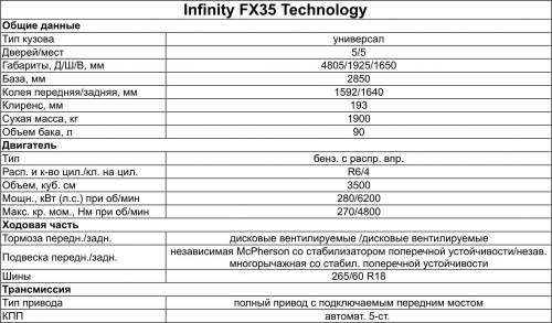 “Младшая” в семействе, модель FX35 оснащается V-образной “шестеркой” объемом 3,5 л мощностью 280 л.с., которую ставят на множество моделей Nissan и Infiniti: алюминиевый блок, по четыре клапана на цилиндр, поршни с молибденовым покрытием и система плавного изменения фаз газораспределения. В общем, обычный для Nissan суперсовременный и высокотехнологичный мотор. Базовый Infiniti FX35 - заднеприводный, но к нам попала полноприводная модификация с “полным фаршем”, жесткой спортивной подвеской и на 20-дюймовых колесах. Цена такой машины 2004 года в Минске - .900. Само по себе сочетание в одном автомобиле полного привода, стильной внешности и высоких динамических характеристик уже мило сердцу белорусского покупателя.
