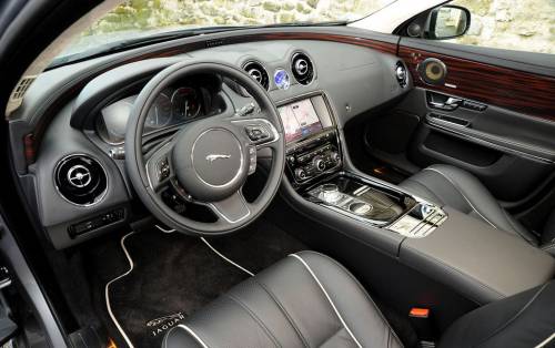 Красота и функциональность дружат и в салоне нового XJ. Изящная центральная консоль смотрится стильно, при этом на ней со вкусом размещены основные органы управления трансмиссией, режимами подвески, а также меню автомобиля, начиная от аудиосистемы и заканчивая навигацией. В центре торпедо, между двумя овальными воздухозаборниками, разместились классические часы с синим циферблатом.