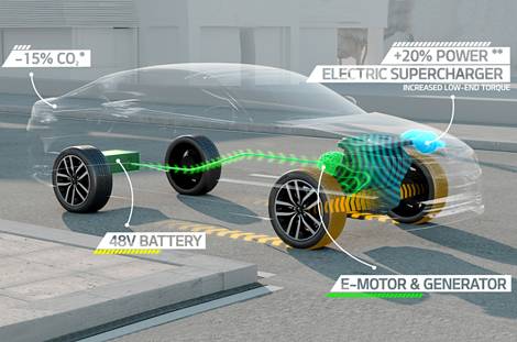 Новая силовая установка состоит из двигателя внутреннего сгорания (его характеристики не указываются), оснащенного механическим нагнетателем с электрическим приводом, который позволяет добиться прибавки момента на низких оборотах.