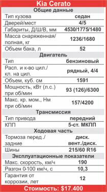 Двухлитровый бензиновый Cerato мощностью 156 л.с. стоит от 17.200 долл. в комплектации Mid, которая отличается от базовой наличием передних противотуманных фар, бортового компьютера, отделкой рулевого колеса и рычага КПП кожей, подогревом передних сидений, более продвинутой аудиосистемой и климат-контролем. А у нас на тесте побывал автомобиль в максимальной комплектации High (.400 – с двигателем 1,6 л, .650 с двигателем 2,0 л), в оснащение которого входили такие опции, как кожаная отделка салона, легкосплавные колеса, ESP и др. Для Cerato во всех трех комплектациях можно заказать 4-ступенчатый «автомат», доплатив 1100 долларов.