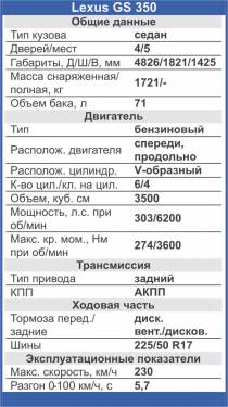 После запуска мотора Lexus не подстегивает к началу дорожной гонки. В нем нет задора BMW и монументальности Мерседеса. Lexus – это стиль и утонченность, скрытые в изящную оболочку. При всей своей мощности двигатель не провоцирует на светофорные гонки, а предполагает динамичное, но плавное движение с мягкими ускорениями и торможениями. 6-ступенчатый «автомат» также настроен на этот стиль езды: переключения не ощущаются, а главное, коробка понимает стиль езды конкретного водителя. Работа АКПП GS 350 скорее вдумчивая и уверенная, чем жесткая и бесшабашная, как у некоторых мощных машин. Но только не подумайте, что этот автомобиль не может ехать быстро. По-смотрите на быстроту динамики разгона, и тогда станет понятно, почему так хочется попробовать на GS то ускорение, о котором заявил производитель в технических данных. В жестком спортивном стиле вождения Lexus так же хорош, как и в спокойном размеренном темпе управления этим изящным седаном. Под благородный рык разбуженного от спячки мотора можно запросто обгонять всех, кто окажется на твоем пути, не глядя на знаки разли-чия на крышках багажников. Пусть они любуются уходящим вдаль силуэтом мелькнувшего японского «болида».