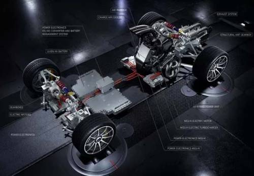 ДВС помогают 408 электрических «лошадей». Два электромотора (по 163 л.с. каждый) расположены на передней оси, по одному используется для коленвала (163 л.с.) и привода турбины (109 л.с.). Суммарная мощность силовой установки достигает 1020 л.с. Корпус 8-ступенчатой роботизированной коробкой передач с одним (!) сцеплением – силовой: к нему крепится подвеска задних колес.