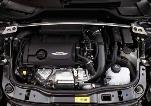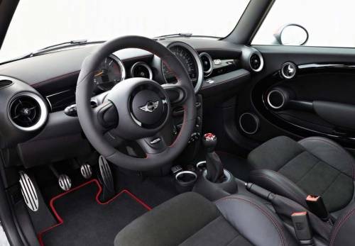 Внутри салон JCW устроен не так скудно, как во многих тюнингованных малолитражках. Пара гоночных сидений со специальными ремнями от фирмы Recaro обеспечивают комфорт и безопасность водителя, а хромированные и красные вставки вкупе с антрацитовым верхом добавляют салону наглости и агрессивности.