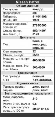 Под капотом Nissan Patrol разместился бензиновый V8 объемом 5,6 литра, который работает в паре с семиступенчатой автоматической коробкой передач. 405-сильный монстр наделяет тяжелый внедорожник отличной динамикой. С паспортными 6,6 с до «сотни» Patrol даст фору любому конкуренту. Причем разгоняется машина одинаково мощно и с места, и со 100 км/ч. Вот только прыть эта напрямую зависит от уровня указателя топлива, который неумолимо падает вместе с каждым нажатием на акселератор. Даже в спокойном режиме расход топлива сложно опустить ниже 20 литров на 100 км пути, ну а если ехать «с ветерком», то 100-литрового бака едва хватит на 400 км.