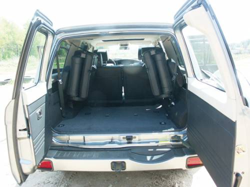 А теперь посмотрим, что наши герои предлагают пассажирам. Задний диван Patrol вполне способен принять трех человек, однако по-настоящему комфортно там смогут разместиться лишь двое. На это, кстати, недвусмысленно указывает пара широких подлокотников, в сложенном виде они, собственно, и образуют спинку третьего сиденья, в них прячутся удобные выкидные подстаканники. Надо сказать, что задние кресла «Патрола» не только легко складываются, открывая доступ в багажник, – подобно передним, они снабжены продольной регулировкой. Ее диапазон, правда, не очень широкий, всего несколько сантиметров, но какая-никакая возможность выиграть дополнительное пространство для ног, не беспокоя сидящих впереди, все же есть.