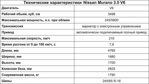 Для труднопроходимых участков у Murano есть положение рычага трансмиссии «L», что отнюдь не означает ряд пониженных передач. Скорее это фиксированное положение шкива, которое не позволяет автомобилю разгоняться. Увеличенный дорожный просвет кроссовера тоже служит для удобства при переезде небольших препятствий. Для легкого бездорожья у Murano есть специальный режим трансмиссии, который включается с помощью кнопки. При этом блокируется межосевой дифференциал и работает постоянный полный привод. Таким образом, качеств асфальтового внедорожника у Murano хоть отбавляй. Их оказалось намного больше, чем у минивэна, несмотря на внешнюю форму, обилие ящичков и «бардачков».
