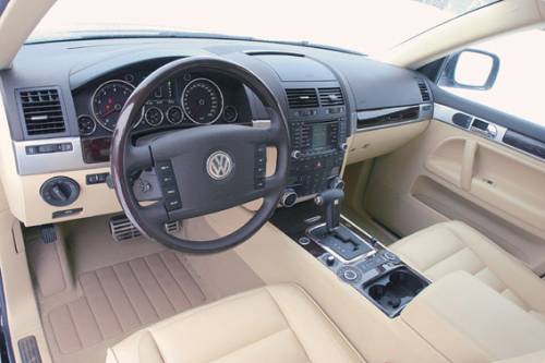 Более дешевый и в то же время привлекательный вариант оформления салона предлагает VW Touareg