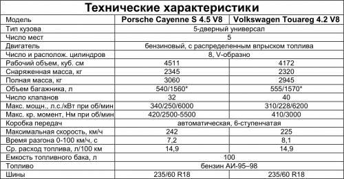 У обеих машин сходная планировка и расположение приборов. Центральную часть приборной панели занимает телевизионный экран со встроенной аудио- и спутниковой навигационной системами, а держатели для стаканов и огромное пространство для мелочевки располагаются за переключателем скоростей. Более того, обе модели укомплектованы очень удобными сиденьями. А если принять во внимание идентичную колесную базу и ширину машин, то совершенно неудивительно, что Touareg соответствует Cayenne в том, что касается объема багажника и удобства пассажиров.