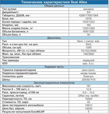 Под капотом Altea 1,6-литровый бензиновый двигатель, известный по ряду моделей как Skoda, так и VW. Он обладает умеренной динамикой и вполне приемлемой топливной экономичностью. Этот «восьмиклапанник» развивает мощность 102 л.с., но не очень любит низкие обороты. Поэтому, включив очередную передачу небольшим рычагом с изумительной избирательностью, сразу стоит поднимать стрелку тахометра в зону средних и высоких оборотов для динамичной езды.