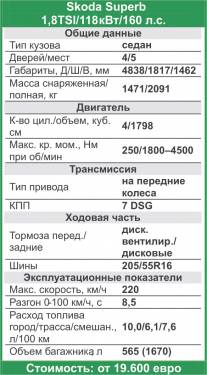 Пока снаружи сделали несколько снимков, благодаря включенному на максимальный режим охлаждения климат-контролю воздух в салоне остыл за считанные минуты. После недолгого знакомства с аудиосистемой мы отправились на городские улицы. Кстати, сенсорное управление волнами FM-приемника путем нажатия на дисплее частоты нужной станции – вещь не только забавная, но и нужная в целях безопасности. Дело в то, что на большом экране высвечивается сразу 6 станций, и можно быстро нажать на любую из них, не отвлекаясь надолго от дороги. Приятная мелочь, от которой не хочется отказываться при покупке машины. Другое открытие – сбалансированная работа коробки DSG c 160-сильным мотором. Вполне возможно, что двигателя меньшего объема в паре с “роботом” окажется для самой большой Skoda маловато, а вот этот в самый раз. На мой взгляд, 1,8-литровый TSI – золотая серединка. Машина оказалось необычно живой на всех режимах разгона. Динамика разгона до «сотни» за 8 с небольшим секунд не позволит на Skoda Superb чувствовать себя неловко как в городе, так и на шоссе. Небольшие турбопровалы и легкие рывки семиступенчатого “робота” DSG при движении в пробках сразу забывались после выезда на оперативный простор. Одного хорошего нажатия на газ достаточно, чтобы Skoda Superb легко ушла с перекрестка первой. Мотор работает при этом абсолютно тихо как на холостом ходу, так и при разгоне. В паре с “роботом” DSG он наделяет большую Skoda хорошими спринтерскими задатками, соблюдая при этом умеренность в потреблении горючего. После динамичного движения в городе борткомпьютер показывал средний расход в районе 11 литров на “сотню”. На минской кольцевой Superb и вовсе перешел на «диету» в 6 л/100 км в мгновенном измерении при скорости 100 км/час.