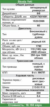 Сейчас Skoda Yeti можно купить с 1,8-литровой бензиновой «четверкой» (160 л.с.) и бензиновым 2,0-литровым дизелем с разной степенью форсировки (110, 140 и 170 л.с.). Цены на 110-сильную переднеприводную дизельную версию начинаются с 15.950 евро. Такой же автомобиль, но с приводом на четыре колеса стоит от 18.350 евро. Кроссоверы с 1,8-литровым двигателем поставляются только в полноприводной модификации и стоят от 17.100 евро, а побывавший на тесте автомобиль в комплектации Ambition дороже на 1050 евро. И бензиновая, и дизельная версия комплектуются только МКПП. С февраля дилеры обещают наладить поставку автомобилей с бензиновой 1,2-литровой «четверкой» (105 л.с.), цены на которые будут начинаться с 13.500 евро за кроссовер с МКПП и с 15.000 евро за кроссовер с DSG.