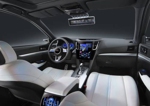 Автомобиль окрашен инновационной краской Ultimate Silver. Концепт оснащен 3,6-литровым бензиновым мотором и полным приводом. Салон – праздник для фаната техники: множество дисплеев, сенсорный монитор вместо традиционной центральной консоли, камеры в боковых зеркалах, мониторы в подголовников. Серийная версия новой Subaru Legacy как известно появится в этом году.