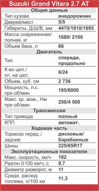 Рулевое управление Витары вполне соответствует негласным стандартам внедорожных авто. Хорошее качество управления достигается благодаря укороченной колесной базе и прочной подвеске. Хотя из-за последней автомобиль несколько потряхивает при езде по неровной дороге. Также Vitara отличается на удивление слабым заносом на поворотах, что нетипично для такого типа автомобилей. Салон предлагает повышенный уровень шумоизоляции. При резком нажатии на газ 2,7-литровый двигатель V6 начинает издавать рев, и создается впечатление, будто Сузуки готов ускориться с места как мотоцикл. Однако “автомат” превосходно справляется со своей работой, и поводы для жалоб по плавности хода отпадают. Мощное ускорение можно назвать коньком Гранд Витары по сравнению с некоторыми японскими “собратьями”. Что касается потребления топлива, то в городе Grand Vitara расходует 14 л/100 км, а на трассе 9,5 л/100 км.