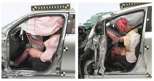 Последствия краш-теста Suzuki Kizashi (слева) и Toyota Prius V (справа), которую кроме всего прочего подвела и поздно раскрывшаяся боковая подушка.