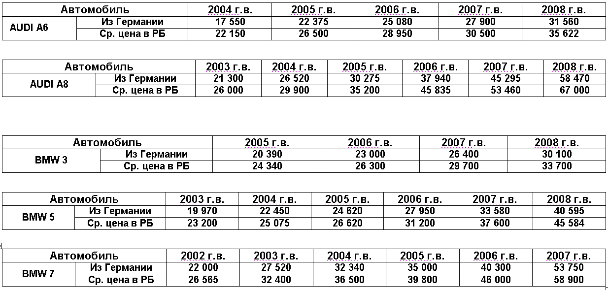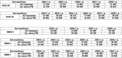 Цены на BMW и Audi в Беларуси держатся довольно долго. Убедиться в этом можно, открыв объявления о продаже автомобилей и посмотрев, сколько сейчас стоит та же «сотка» 1986 г.в. Более новые модели – не исключение: цена на них, как правило, падает только в первый год после покупки из-за высокой стоимости автомобиля в салоне. Дальше можно не беспокоиться, что, наматывая километры, вы теряете огромное количество денег. Audi A6 2004 г.в. с базовым двухлитровым мотором и пробегом 120-150 тыс. км, например, на рынке стоит в среднем 22-23 тыс. у.е. Можно найти более дорогую комплектацию с более мощным двигателем за соответствующую стоимость. Аналогичная модель, прибывшая из Европы обойдется вам в общей сложности в 17.550 у.е. Чувствуете разницу? И это далеко не предел. Около шести тысяч долларов можно сэкономить, заказав из Германии автомобиль BMW 730d. А при покупке всеми любимой Audi A8 2008 года выпуска, можно «утяжелить» свой кошелек почти на 10 тыс. у.е.! Как вам такие цифры?
